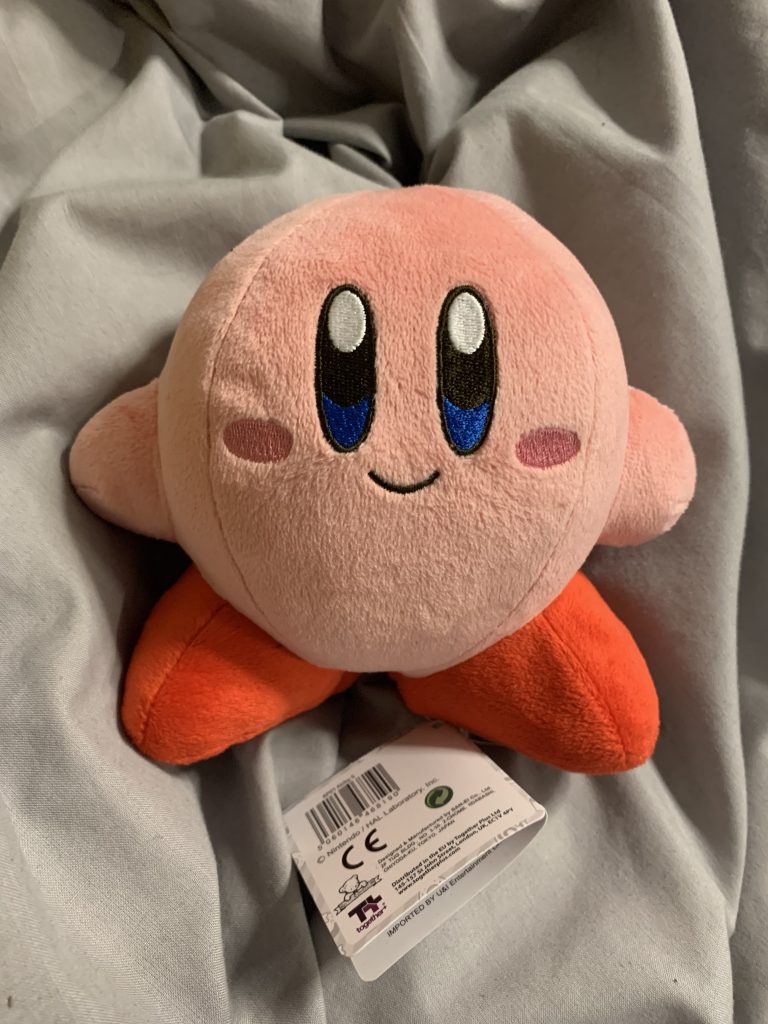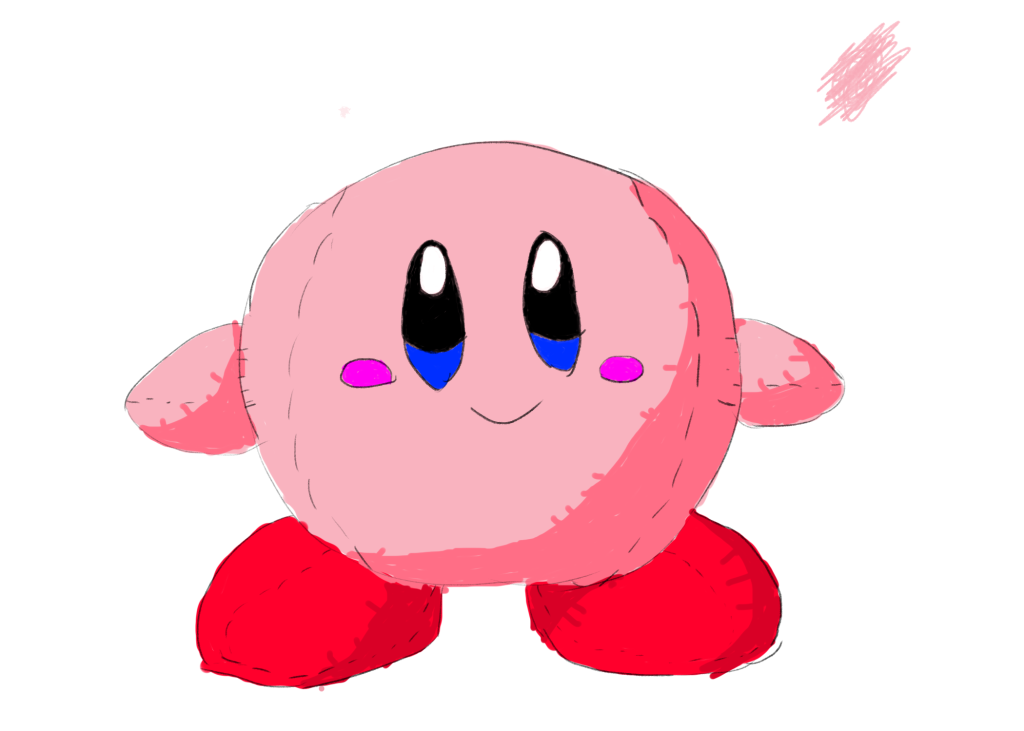 This is the drawing that I came up with based on the plush. This is the first image that I have drawn that I was actually somewhat happy with the outcome as while it isn’t anything amazing, it is a vast improvement. I started off by outlining Kirby’s body as well as his arms and legs. This was quite easy as he is made up of many basic shapes. I closely followed the dimensions of the plush as a reference for parts such as the distance between the eyes and the mouth. After I was done with the outline, I began colouring in. I began by doing a flat colour layer where I coloured in the main body. After this I selected a shadow using a slightly darker shade of pink. I used the same colours for both the body and arms, however I used red instead for the shoes. I am very happy with the way the shading went on the left shoe. After I was done with this I added the eyes and blush on the cheeks. For these I simply used flat colour, carefully referencing the colours on the plush. Finally I finished it off by adding stitch marks to make it clear that the drawing is meant to be a plush.