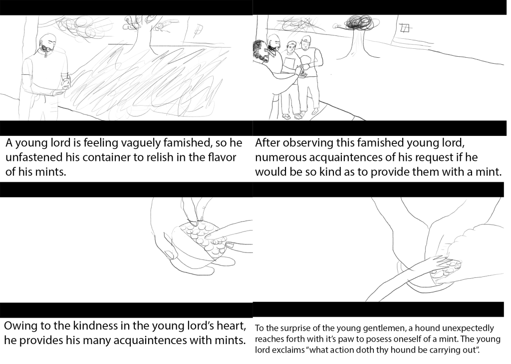Here is the full storyboard that I designed. It is quite simple, however it gets the story across somewhat effectively. In the first frame, I draw the first man holding a pack of mints. I draw a tree and a small house in the background for a bit of extra detail. In the second frame, I draw the other three men coming up to ask the first man for mints. The same details are still there in the background. In the third frame, I drew a closeup of the box of mints with three hands reaching for it. This is where one of the biggest flaws in my storyboard is as I am not great at drawing hands. In the fourth image, I added the dogs paw reaching for the mint. In the text below each image, I explain the storyline behind the image.