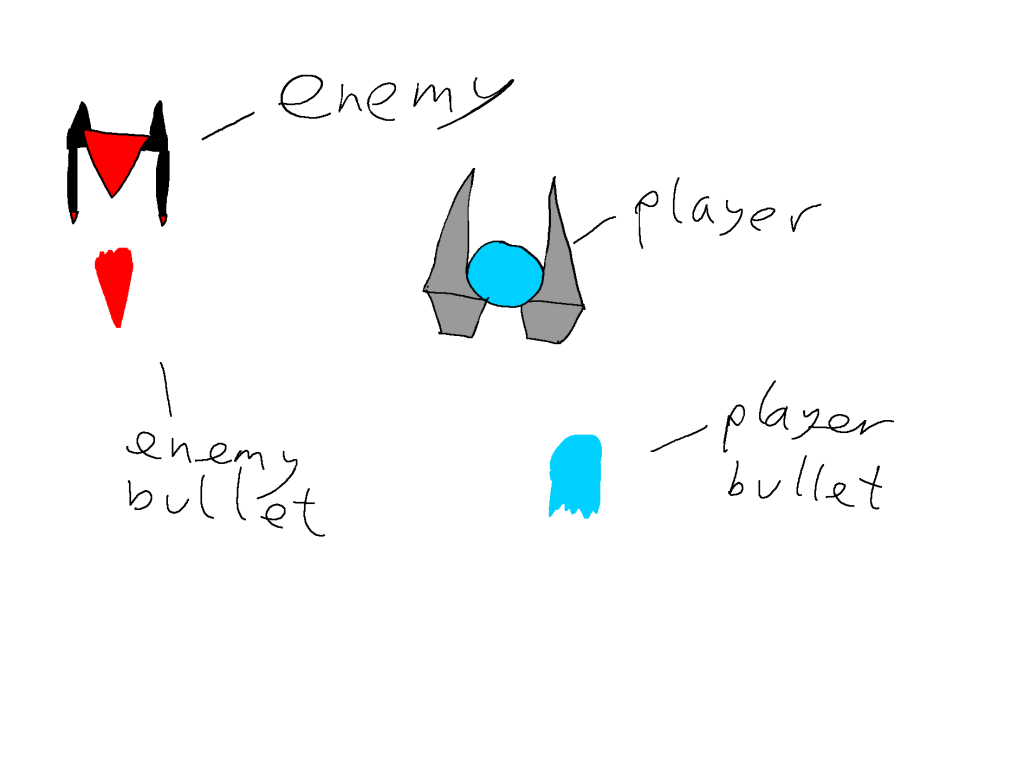 The image above is my ship art. I ignored the shape theory that I used in my previous drawings however I kept to the red/blue contrasting colour scheme in both. The shape for this one is more angular than the previous one, however I’m a lot happier with the way this one looks. This is the player bullet. I roughly kept to the same design for it however I added more detail through shading. I kept to the blue colour scheme and the rounded shape as I found both of these to work well.This is a redesign I did for my enemy ship design. I redesigned it to look like a bird instead as it is more unique than just having another spaceship. I kept to the red colour scheme however I went with a much darker red this time. I think that I could improve this drawing later on by including shading. This is the enemy bullet. As much as I would like to go into detail about it, I simply flipped the player bullet and changed the colour to red. Despite that it does what it needs to do quite effectively.