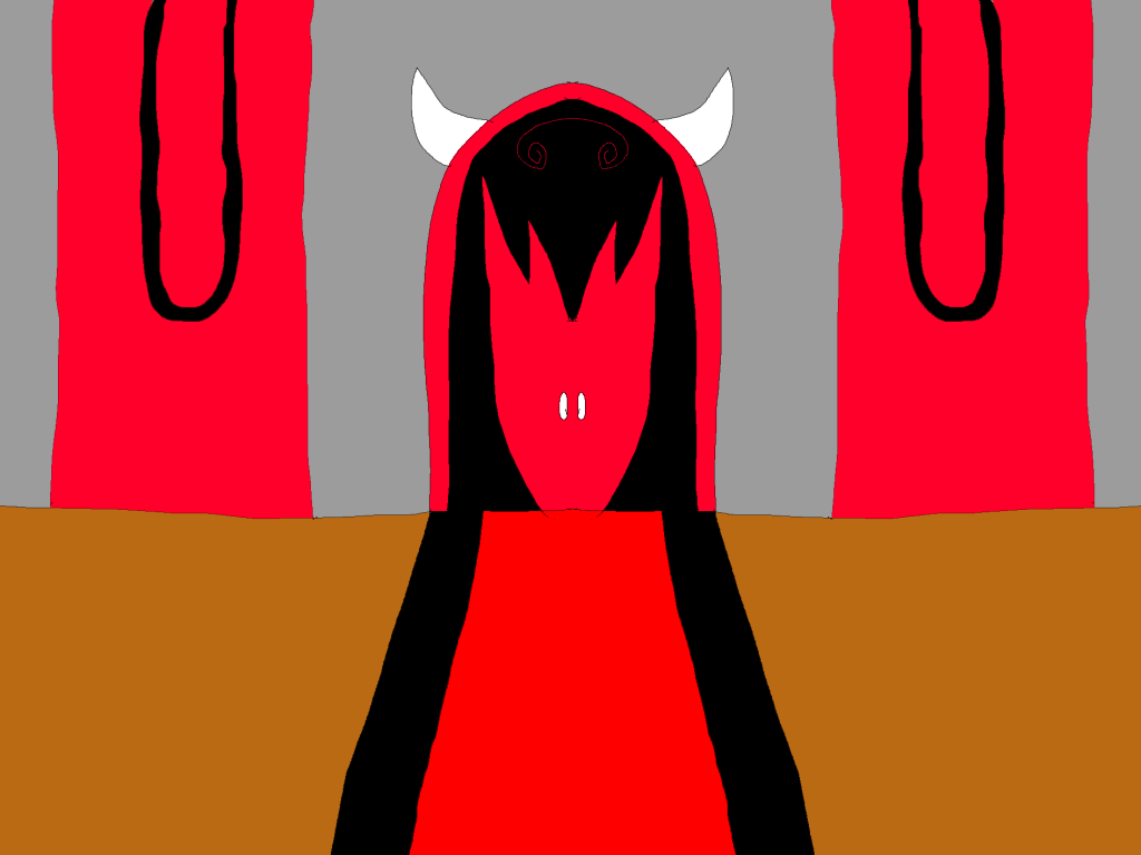 This is what the door looks like, I will be changing up the colour scheme slightlyThis is what I ended up drawing. I didn’t do any shading as I had zero knowledge of shading at the time when I made this. I decided to use a similar black and red colour scheme to my initial character design. I chose to make the floor brown to represent that it is made out of wood and I included a black and red carpet in the centre leading towards the door. I included two identical banners on each side of the room and then drew the door itself. I added a simple black and red pattern on the door slightly inspired by the pattern that I added to the cloak of the character that I drew earlier on. I then also decided to add horns to the door, similar to the horns that were on my character. To help illustrate that the door is the main focus of the image, I decided to make the carpet get thinner as it gets closer to the door. This creates a feeling of depth. In conclusion however, I am not happy with the way that this turns out and would like to revisit it when my art skills have improved in the future.