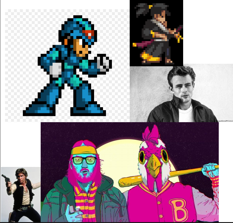 Here is a small moodboard I made with some influences for my character. The Han Solo influence is incredibly obvious in the colour of my jacket. I also looked at some of my favourite pixel art games such as Mega Man X and Katana Zero for inspiration. Here is the character design that I came up with. I am somewhat happy with the design however I believe that it would be a lot better if I added some more shading as I only shaded the jeans. The design was primarily inspired by Han Solo and James Dean however I changed it up slightly by adding a different hair colour. I curved the character’s arm and made him put it on his waist to give it a bit more personality. I decided to go for a darker colour scheme with this piece to show that he is from a rough area. I am not very happy with the way the face looks as I think the eyes could look a lot better.